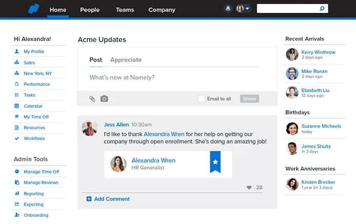 “Namely’s social media-like news feed is what sold me over two years ago, and it’s still ingrained in our company culture to this day. On the news feed, employees can view each other’s birthdays and work anniversaries. Have you ever walked into a meeting and felt badly that you didn’t know it was someone else’s birthday? That doesn’t happen anymore because employees can just look at Namely’s news feed. When an employee wants to give a coworker kudos, they can use the news feed’s appreciation feature. From an HR and executive team perspective, we use the news feed to share company news and announce employee awards, such as ‘Sales Employees of the Year’. Every employee also has a profile with their picture on it—which is especially helpful for new hires.